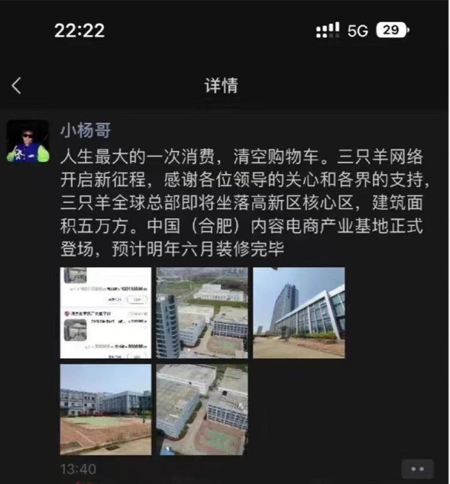 依照“小杨哥”前述该文及新闻报道标题(智能手机缴付网页截屏)表明:这个“双十一”移走科季夫,完成了他们一生最大的一次消费需求——耗费103118580元(除此之外还缴付了50多万元“应用软件额外费用”),在合肥市芜湖市经济技术开发区买回(竞投)了两处总占地面积高达5平方米的房产,将作为他们母公司“三只羊”未来全球公司总部暨中国(芜湖)文本电商产业培训基地,预计今年下月(2023年)6月家装完!